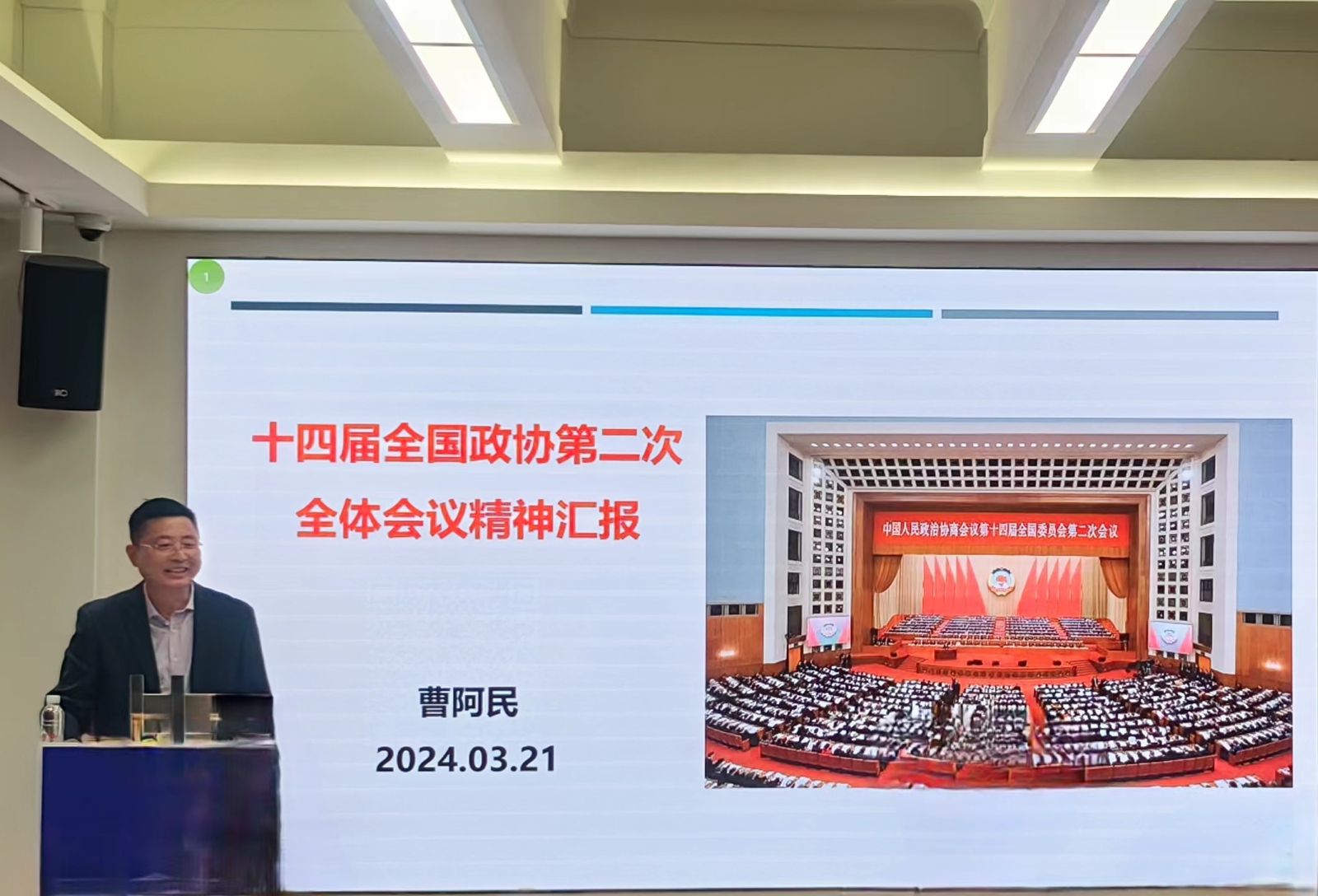 曹阿民围绕参加十四届全国政协第二次全体会议基本情况、科技界别小组及委员讨论关注热点和参加两会的感想作专题汇报。他介绍,委员们围绕经济、政治、文化、社会、生态文明建设等方面,积极建言献策、共商国是。他表示要持续深入学习习近平新时代中国特色社会主义思想,发挥委员时代担当作用;要发挥专业特长,围绕中心服务大局履职尽责;要发挥科技系统分会特长,围绕科技创新、人才强国、高水平开放、发展新质生产力等积极建言。