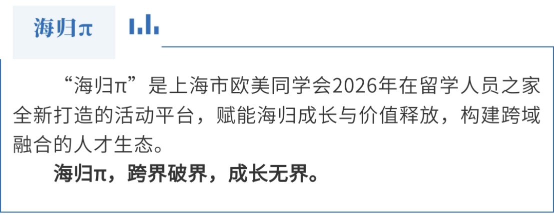 作为上海市欧美同学会2026年全新打造的活动品牌,“海归π”将持续赋能海归成长,构建跨界融合的人才生态,后续还将开展不同行业领域分享、企业路演等系列创新创业活动,敬请关注!