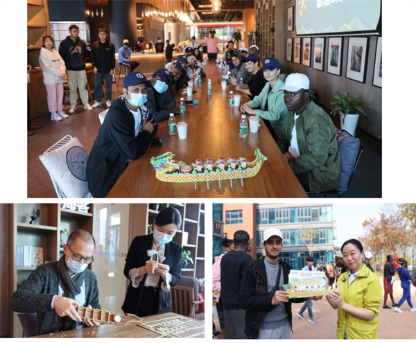 动手体验环节,来自海事大学龙舟队的运动员向国际学生和来宾们介绍了一支龙舟队中划手、鼓手、舵手的职能分工,重点讲解了划手的坐姿、握桨、入水、拉手、御水空中移桨和集体配合、节奏,鼓手的指挥、鼓点等等技术要领,并现场开展示范教学。在龙舟队运动员们的带领下,大家投入到龙舟模拟训练中,练习划桨姿势、敲击龙舟鼓点。现场鼓声隆隆,国际学生们对应鼓点,喊响号子,划桨动作整齐划一,颇具一番热闹景象。此外,龙舟船模的DIY也让国际学生们看到了通过动手拼接搭建出的龙舟立体造型。看着拥有完整龙头龙尾且鼓、桨、旌旗俱全的龙舟模型和船上奋力划船的队员们,大家对下水一试身手更是充满了期待。
