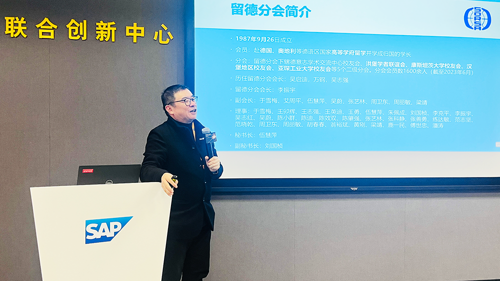 分会会长李振宇首先介绍了留德分会,并从中西文化对比以及大中华文化博大包容的特点入手阐述了中国善于吸收外来精华且能源源不断提高技能并应用在实践中的观点。SAP联合创新中心总经理鄂超以“共同引领创新, 共筑生态未来”为题为参会者带来了SAP对于创新和合作伙伴生态的战略和实施规划。