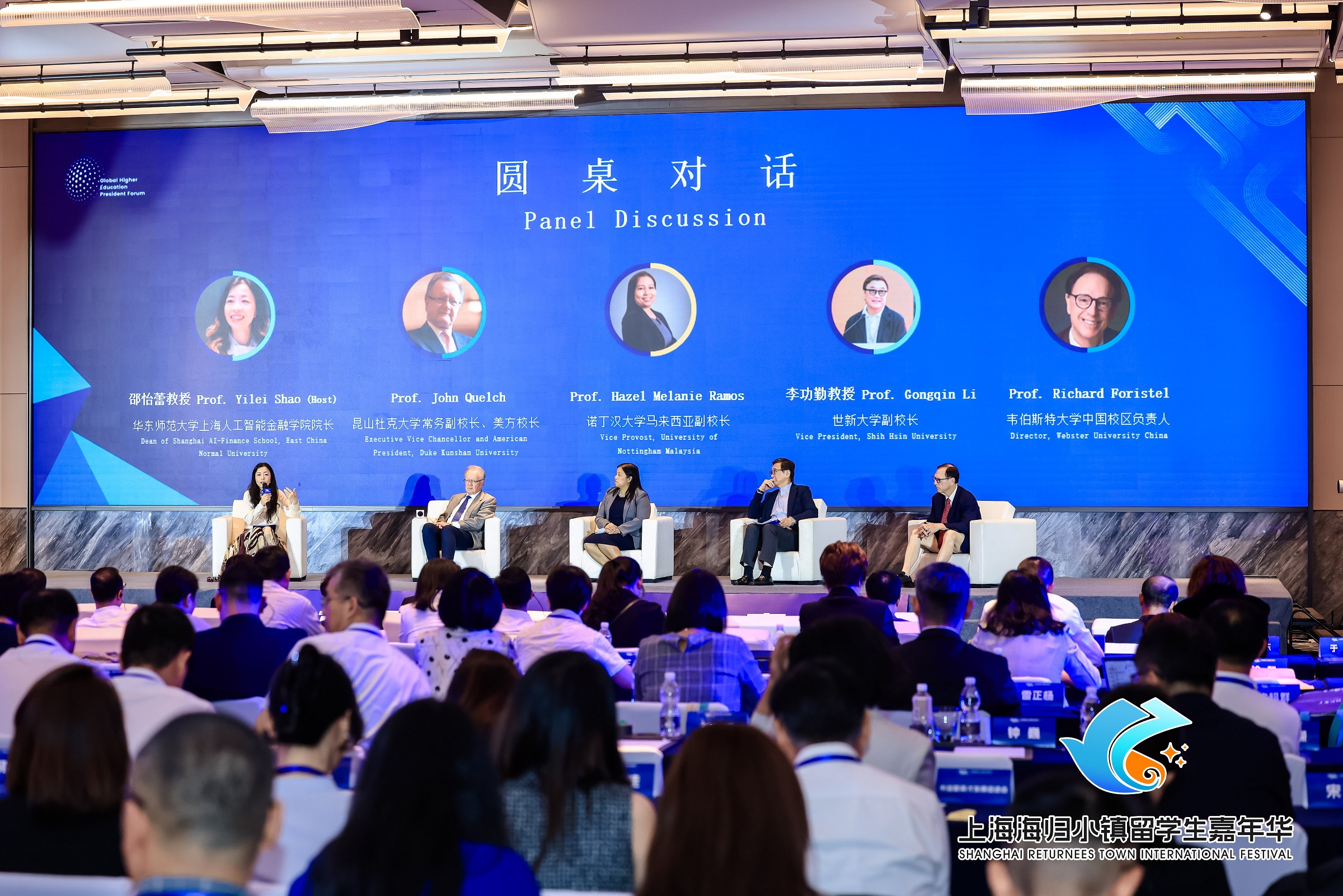 圆桌对话环节由华东师范大学上海人工智能金融学院院长邵怡蕾教授主持,昆山杜克大学常务副校长Prof. John Quelch、诺丁汉大学马来西亚副教务长Prof. Hazel Melanie Ramos、世新大学副校长李功勤教授、韦伯斯特大学中国校区负责人Prof. Richard Foristel,就人工智能重塑教育生态等议题展开深度对话,碰撞思想火花。论坛不仅展示了“AI+教育”的多元实践与前瞻洞察,更成功搭建起一个高规格、宽视野、深融合的国际教育对话平台,为推动全球高等教育在智能时代的协同创新与资源融通奠定了坚实基础。