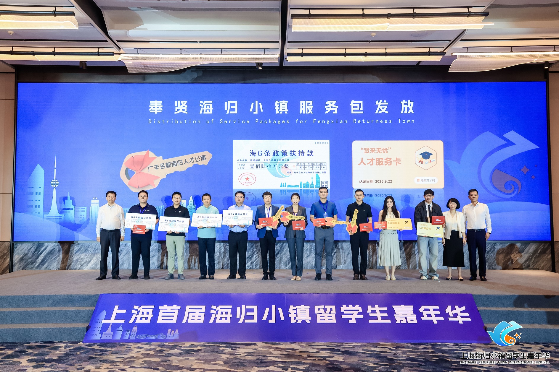 开幕式现场,涵盖生物科技、智能终端等领域的8家优秀海归企业现场签约。紧接着,政策服务礼包发放环节将现场气氛推向高潮,包括“海六条”政策在内,奉贤区为10家企业颁发了涵盖了政务、产业、人才、生活多维度共计37项服务在内的“政策服务礼包”。对照“海六条”政策,为企业现场兑现颁发开办支票、贤才卡和人才公寓钥匙。真正体现了奉贤区“一次对接、全程无忧”的服务理念和助力海归人才“落地无忧、成长有路”的坚定决心。