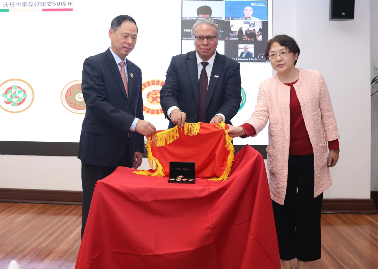 墨西哥驻沪副总领事范逸鑫(Carlos Valera),原同济大学党委副书记、上海济光学院党委书记姜富明,我会专职副会长朱玲玲为纪念徽章揭幕
