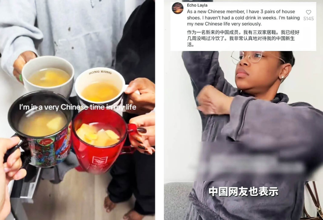 这场热潮的“点火者”通常被认为是22岁的美国华裔女孩朱溪瑞(Sherry Xiiruii)。2025年12月,她在TikTok上发布了一条幽默视频,以不容置疑的口吻宣布:“从明天开始,你要变成中国人了。”随后,她列出了一份“中式生活守则”:进门穿棉拖鞋、早餐喝热粥、正餐吃红烧肉、戒掉冰饮、注重保暖等等。这条视频迅速获得数百万播放,评论区被“我正在变成中国人”的留言淹没。