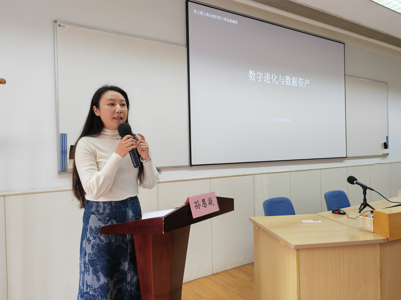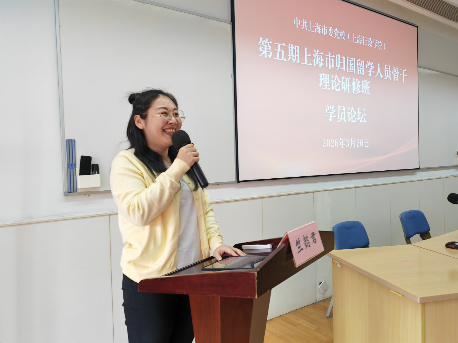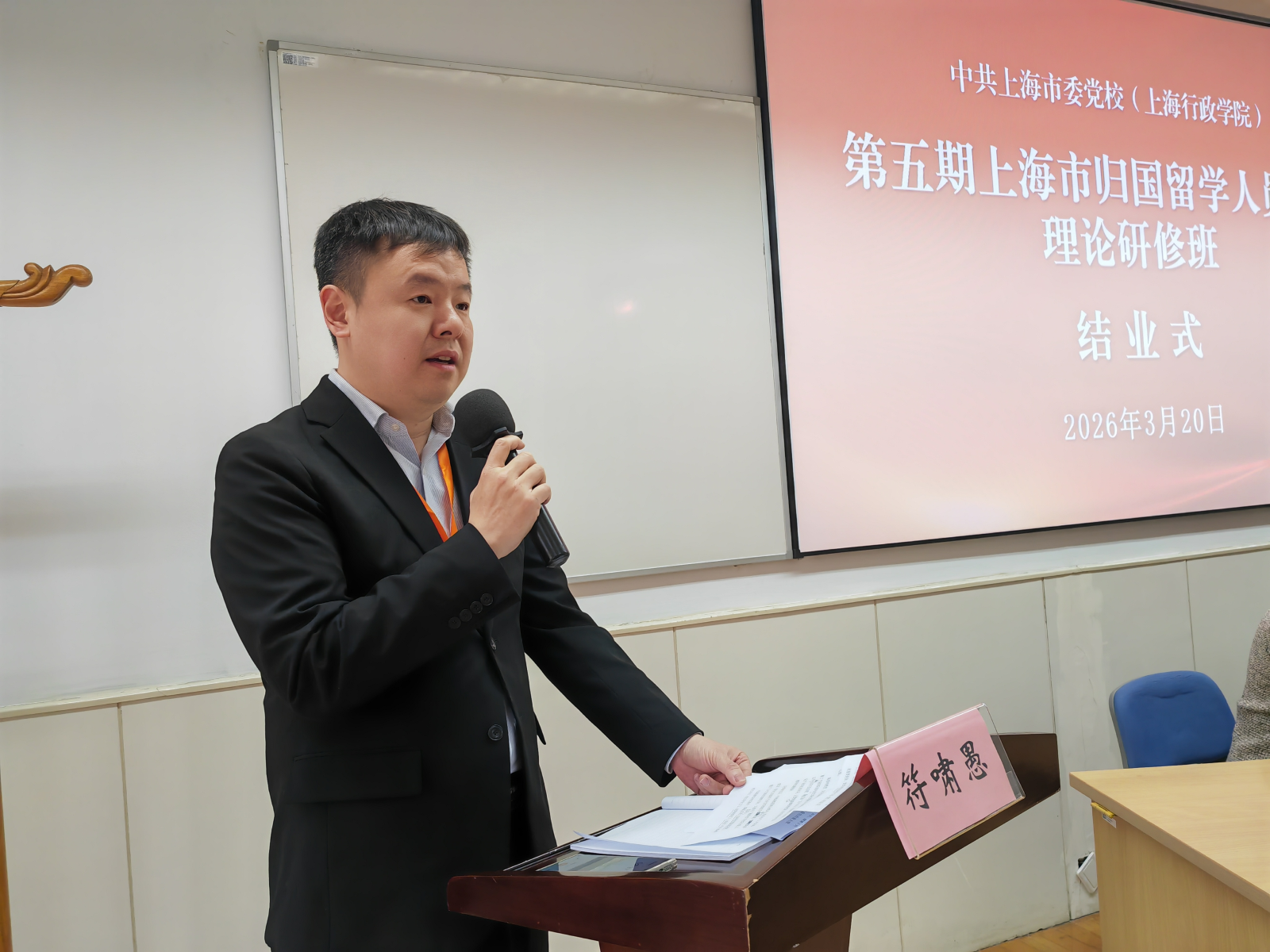 学员论坛上,6位学员代表结合自身实践,围绕“上海建设高水平人才高地,留学人员如何担当有为”的主题分享了思考与成果;结业式上,班长符啸愚代表全体学员作培训总结发言。