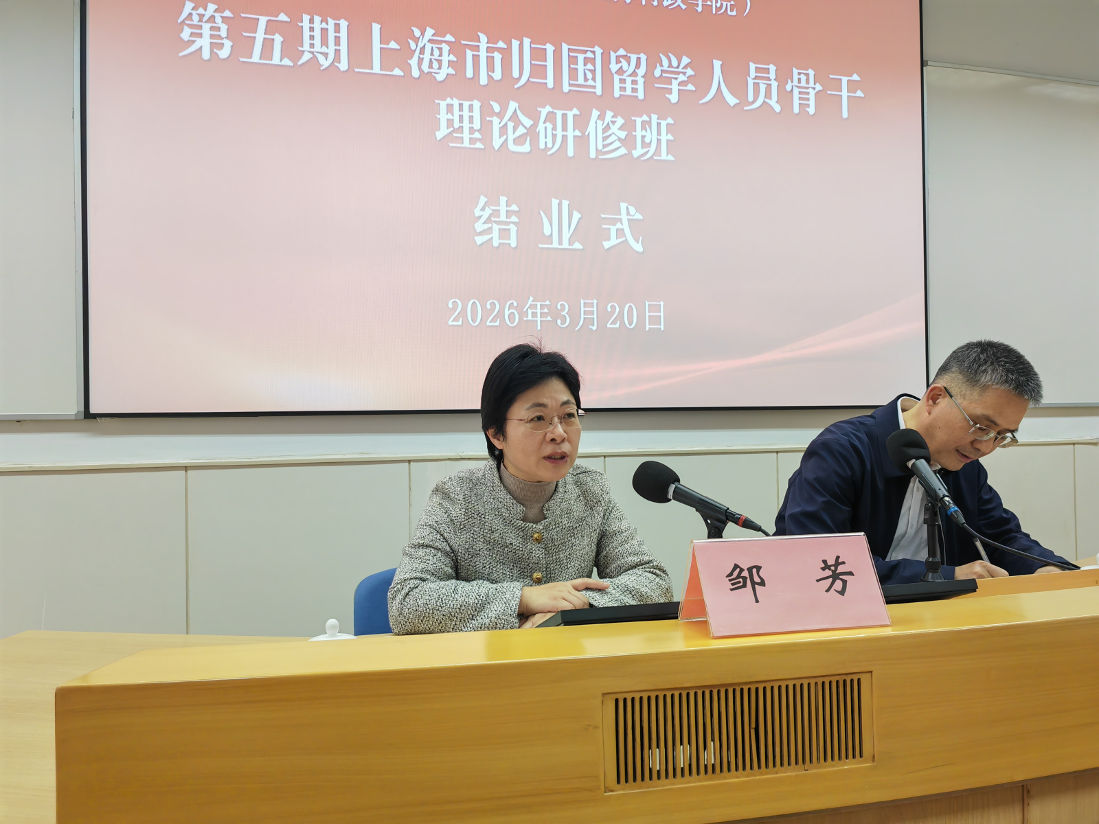 上海市欧美同学会专职副会长邹芳在结业式上,对学员们提出了三点期望:一要认清自我、融入环境,提升思想力、鉴别力、判断力,坚定政治方向,增强政治意识;二要丰富内涵、实现价值,持续加强理论学习,筑牢信仰根基,将海外所学转化为报国实践,践行留学报国使命担当;三要践行使命、服务社会,充分发挥自身海外联系优势,做好民间外交与文明传播,展现海归群体的良好形象。