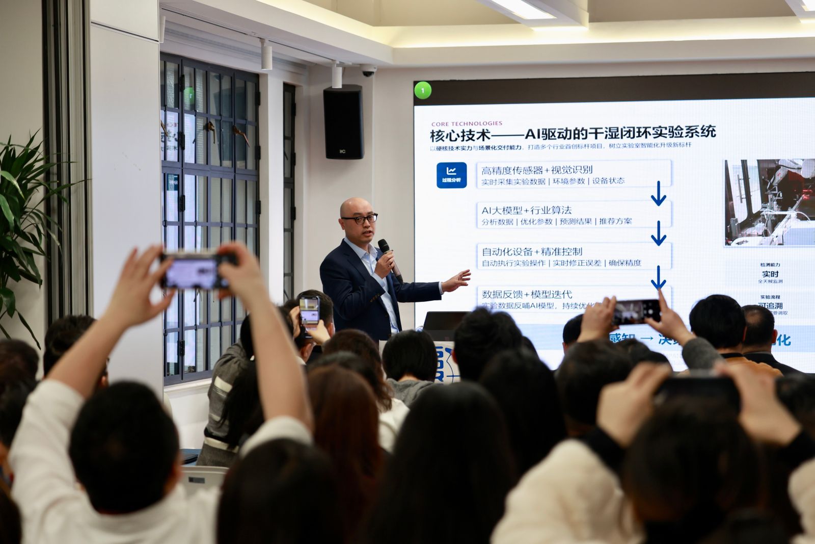 正从科技创始人吴俊伟以“AI+自动化实验:让研发从两年变一个月”为题,通过视频演示了AI指挥机器人做实验的场景。他首先用一组数据勾勒出行业趋势:礼来与英伟达合作共建AI共创实验室,投资高达10亿美元;Ginkgo Bioworks与OpenAI深度合作,6轮迭代后细胞产量提升3倍;华盛顿大学David Baker教授用AI生成新蛋白功能,科罗拉多大学教授用AlphaFold将10年实验压缩至30分钟。全行业都在拥抱AI,药物研发已进入“设计爆炸”时代,而最稀缺的是切入的“验证基础设施”。