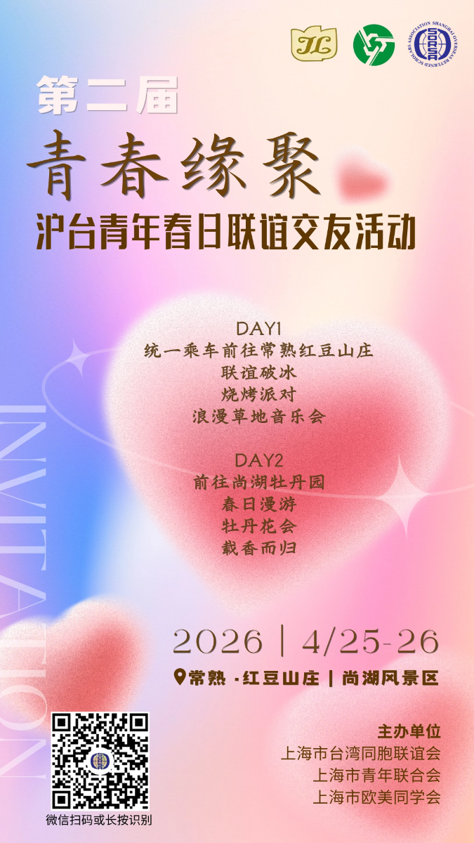 为助力沪台青年发展,帮助两岸青年缔结友谊、丰富生活,上海市欧美同学会将联合上海市台湾同胞联谊会、上海市青年联合会共同举办第二届“青春缘聚”沪台青年联谊交友活动。
