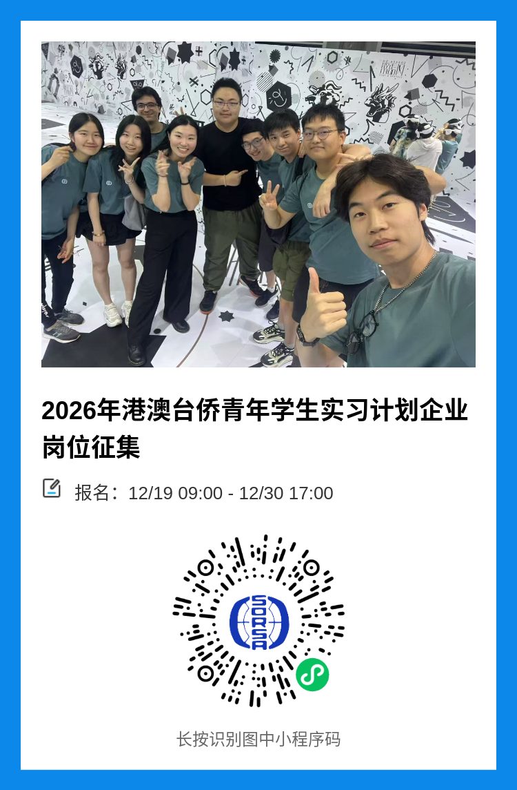 为帮助港澳台侨青年增进中华文化认同,2026年拟继续开展港澳台侨青年学生来沪实习计划(4-8周)。现面向全会征集实习岗位,请各位学长积极提供实习企业和岗位。