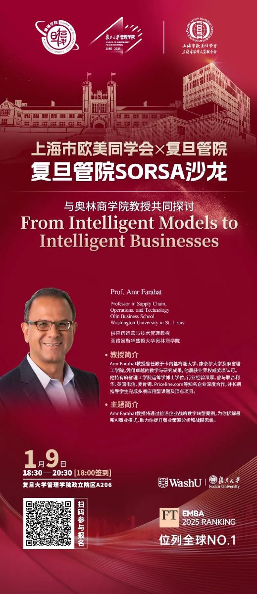 2026年1月9日(周五)晚6:30~8:30,复旦管院SORSA沙龙,特邀来自美国圣路易斯华盛顿大学奥林商学院的供应链运营与技术管理教授Amr Farahat,为大家带来《From Intelligent Models to Intelligent Businesses》主题公开课。他将通过前沿企业战略数字转型案例,为你拆解最新AI商业模式,助力你提升商业策略分析和战略思维。欢迎各位预约扫码报名,出席活动!