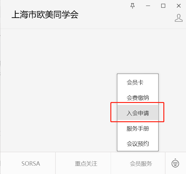 (2)关注下方上海市欧美同学会公众号,点击下方会员服务-入户申请,进入入会申请页面。