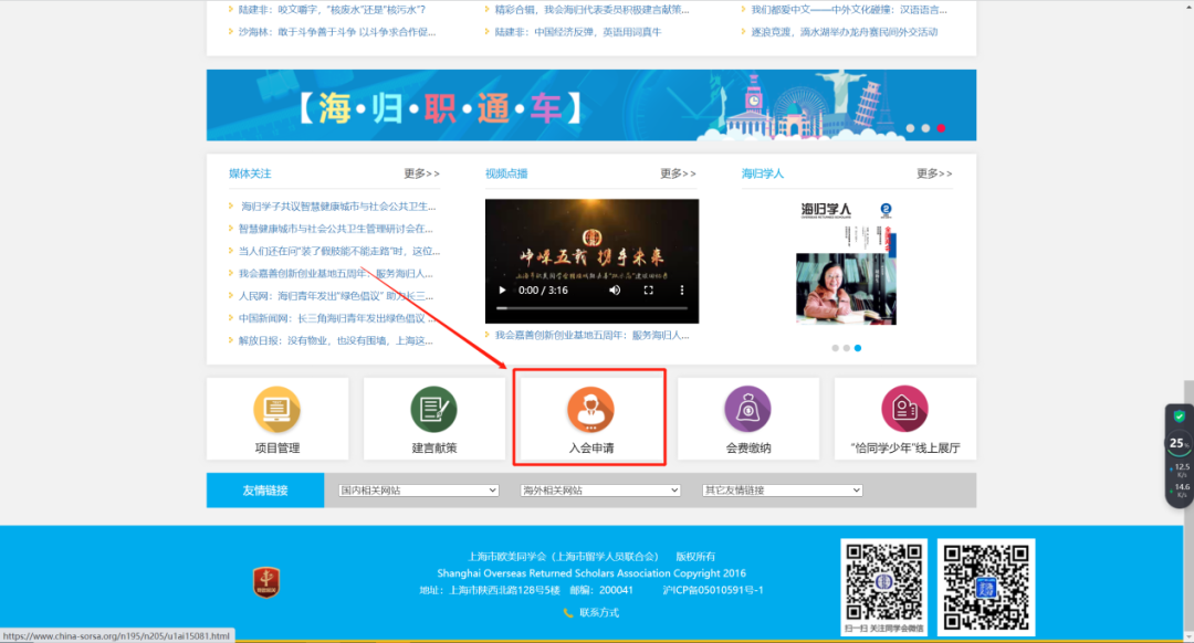 (3)访问上海市欧美同学会网站(www.china-sorsa.org)首页,点击下方入会申请板块,扫描入会申请二维码,进入申请页面。