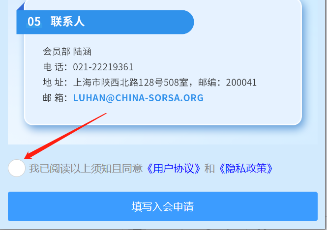 请申请人仔细阅读入会须知、《用户协议》和《隐私政策》,如无相关问题,请勾选同意,并点击填写入会申请按钮,申请入会。