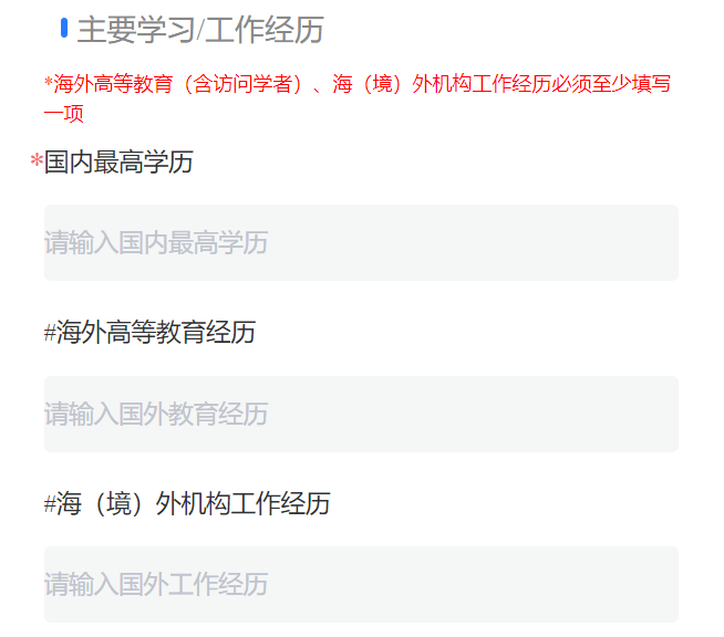 主要学习/工作经历:国内最高学历为必填项,海外高等教育经历 (含访问学者)、海(境)外机构工作经历必须至少填写一项。