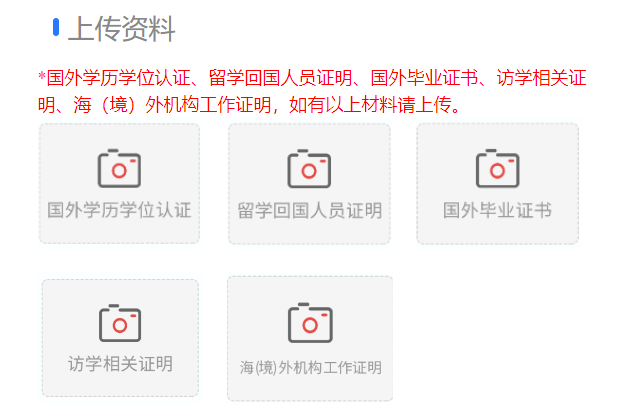 上传资料:国外学历学位认证、留学回国人员证明、国外毕业证书、访学相关证明、海(境)外机构工作证明,如有以上材料请上传。