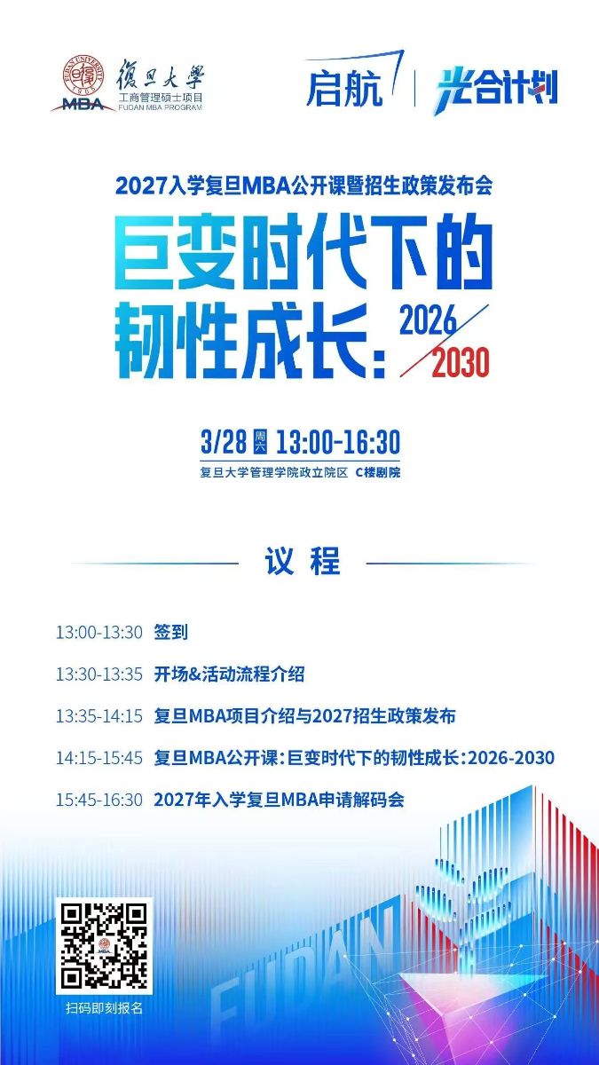 本周六将举办2027入学复旦MBA公开课暨招生政策发布会,主题为:“巨变时代下的韧性成长”,届时将为大家全面解析复旦MBA培养体系等内容。