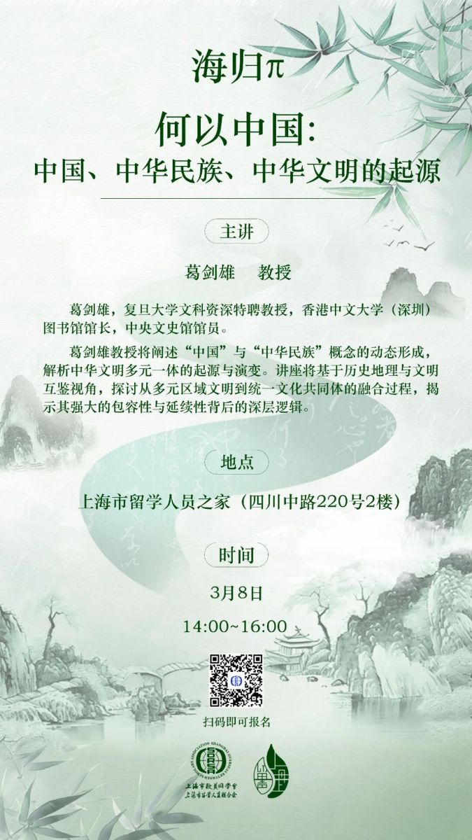 欢迎扫描上方二维码,参加上海市留学人员之家“海归π”系列活动——“何以中国: 中国、中华民族、中华文明的起源”,共同聆听、思考,对话文明源流!