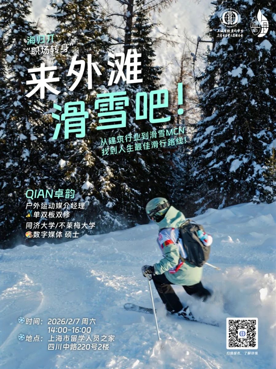 本期嘉宾是从2015年起就开始外滑,单双板双修的滑雪达人,曾留学德国、芬兰、丹麦诸多设计院校的QIAN卓韵学长。她将于2月7日下午,在上海市留学人员之家,为大家介绍她从海归设计师转型滑雪及户外运动媒介经理的奇妙经历。