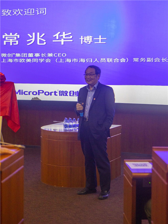 常兆华在致辞中回顾了成立微创分会的初衷,他用十六个字概括为:“合纵连横、互联互通、互帮互助、微联微通”。微创集团现有留学归国人员403名,他勉励微创分会第一届理事班子和会员们要以分会成立为契机,讲好“微创故事”,积极参加市总会活动,与兄弟分会广泛开展合作。同时,进一步壮大分会队伍,争取吸引更多的微创海归人员加入组织,努力成为留学人员的温暖之家。