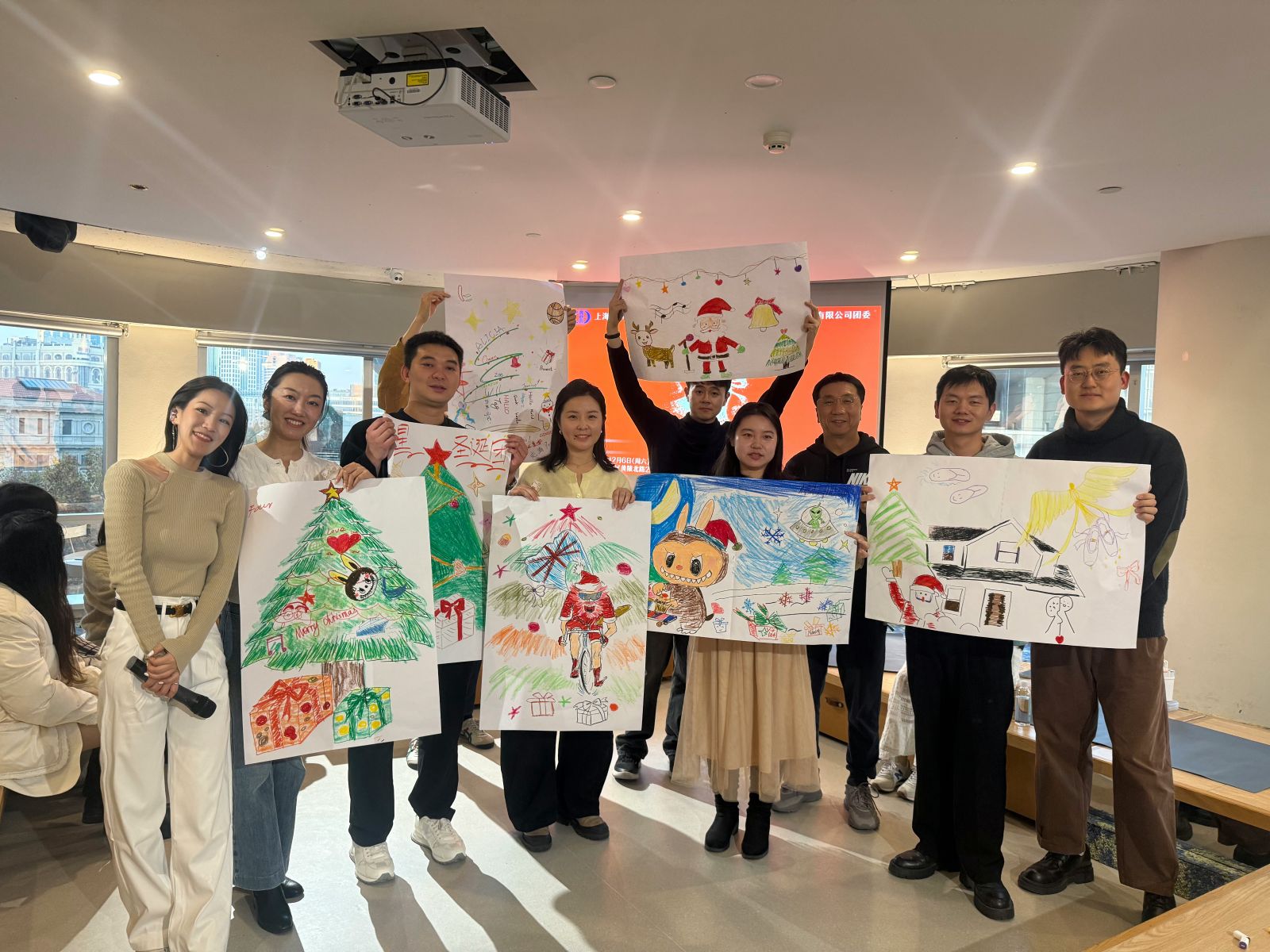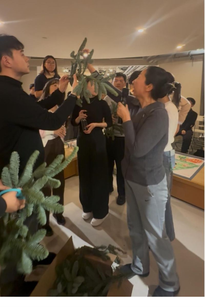 大家通过抽签随机组队,在轻松的氛围中迅速破冰。随后,各小组一同投入到节日画与节日花环的创作之中。团队成员在动手实践中相互配合、交流想法。每一组都用心打磨自己的作品,一幅幅充满巧思的节日画与一个个精致美观的花环陆续亮相。创意与心意交织,赢得了现场阵阵掌声与认可。