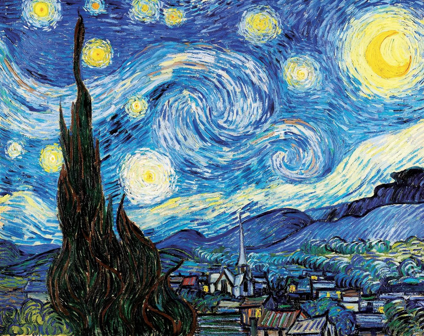 荷兰画家梵·高的《星夜》,是其知名度最高的画作之一。油画让圆化了的弯月与十一颗奇幻的星“眼”围绕着婉转的银河起伏涌动起来。太极图似的线条、蓝色的漩涡、金黄色的星光,给人一种灵魂与浩大宇宙呼应对话的感觉。星空底下的山庄和小屋是那么静谧,似乎那里的农人并不知晓天空在涌动和舞蹈。真是可惜了,因为这样的繁星奇景会即刻消失的呀!画幅左边近景中冲天的丝柏树像火舌在燃烧,又像努力攀升着要去接触星辰,这正是大地对天空的渴望。星空与山庄之间的蓝色山脉波涛起伏、绵延不绝。整幅画作五彩迷目、似真似幻,直令观者震撼、感动!在纽约现代艺术博物馆里,围拢来的人们,面对《星夜》真迹时情不自禁地喊叫,其实是看到了自己的情绪和内心,惊叹于它们竟然被画家大胆而奇妙地展现出来了。
