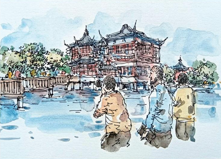 3.下午,小马和李涛陪同俄罗斯客人前往豫园。斯梅尔科夫第一次看到经典的中国传统建筑与园林,他站在湖边远观湖心亭,连声感叹中国传统建筑的工艺精致与保存完整。